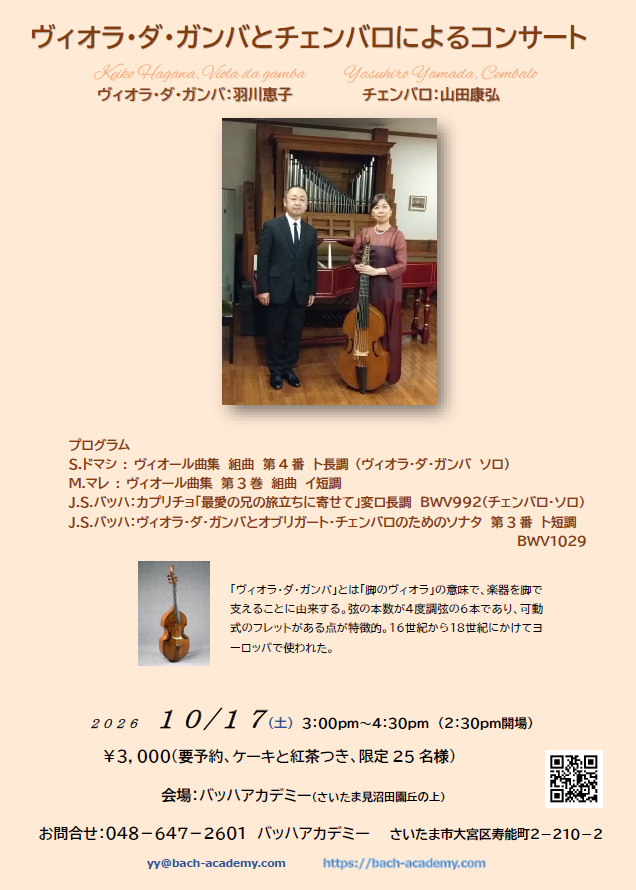 2026 10/17 (土)3:00pm~4:30pm バッハアカデミー(東武アーバンパークライン大宮公園)